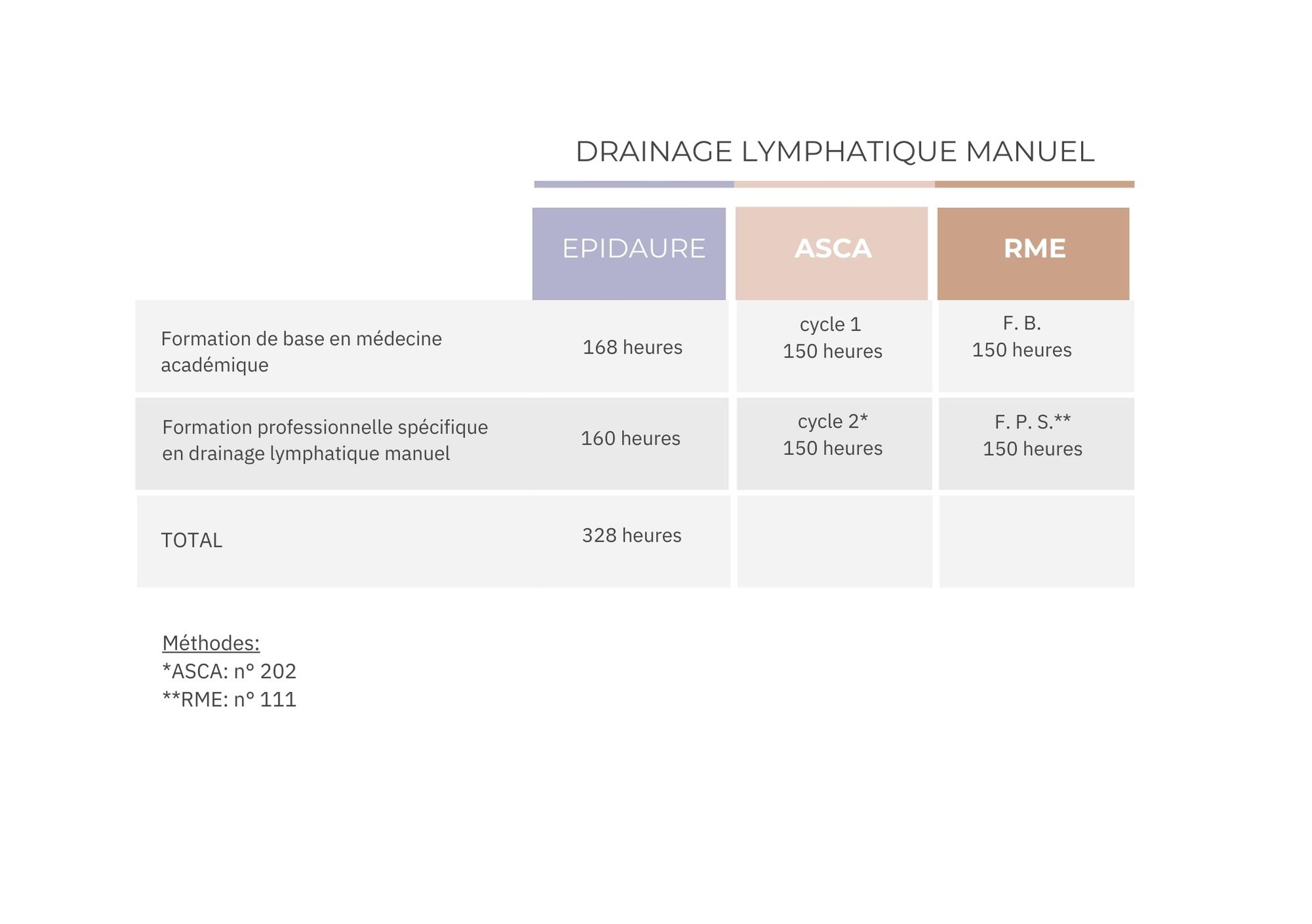 Dénomination technique: Cette formation en drainage lymphatique manuel (160h) correspond au ‘cycle 2’ de la fondation ASCA (méthode n° 202) et répond aux critères de la formation professionnelle spécifique du registre RME (méthode n° 111).