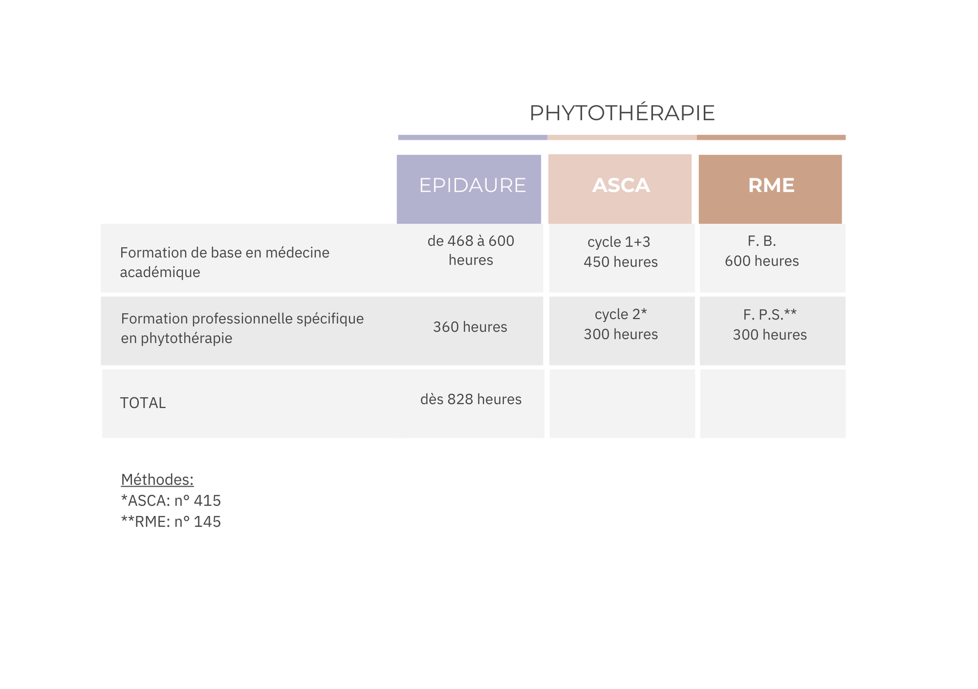 = un total de 828 heures permettant une agrégation auprès de l’ASCA en Phytothérapie (MCO). Pour le registre RME, un total de 1’800 heures de formation de naturopathe permettent de répondre aux critères d’enregistrement de cette méthode.